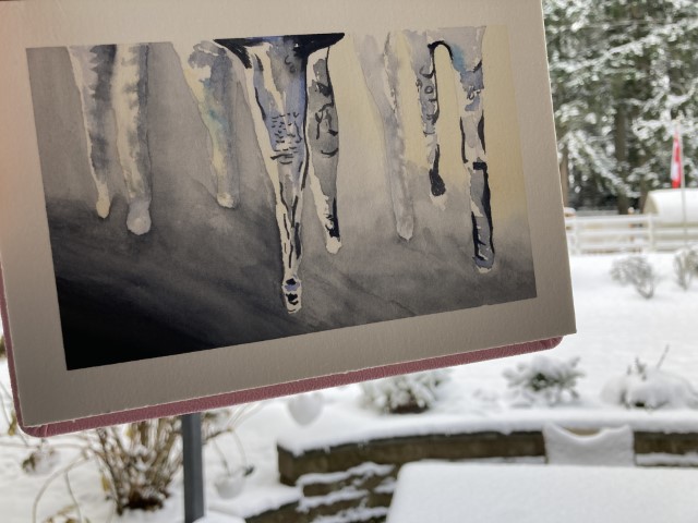 It rarely snows at my house. So, when it does snow, and especially when it snows on Christmas, it seems like a gift. My walk this morning was cold, yet quiet and peaceful. When I returned to my zen-art room, I flicked on the twinkly Christmas lights and followed along with Emily Olsen’s icicle tutorial and I realized that my cool grays (just like my neighborhood skies) seemed warm and cozy.