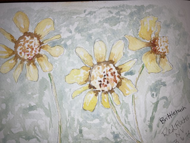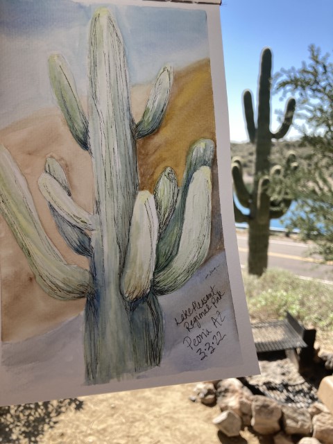 I was inspired by the “late winter” colors of the deserts in NV, AZ, and CA. So I decided to try to capture their brilliance in quick “urban sketches” … seems funny to call these “urban” since I was in the wilderness most of the time with no buildings except for outhouses..Maybe I should just say these are “plein air” but that doesn’t seem right either … so, whatever these paintings should be called, it was fun to push myself to sketch quickly and attempt to mix colors to match the surroundings. I especially appreciated being in the moment and allowing myself the freedom to play.