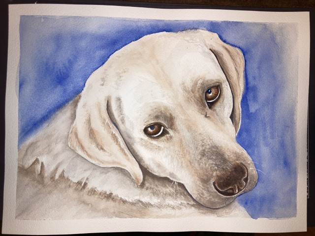 Deedle the Yellow Lab: Arches cold pressed; Daniel Smith – Ultra Marine, Burnt Siena, Burnt Umber