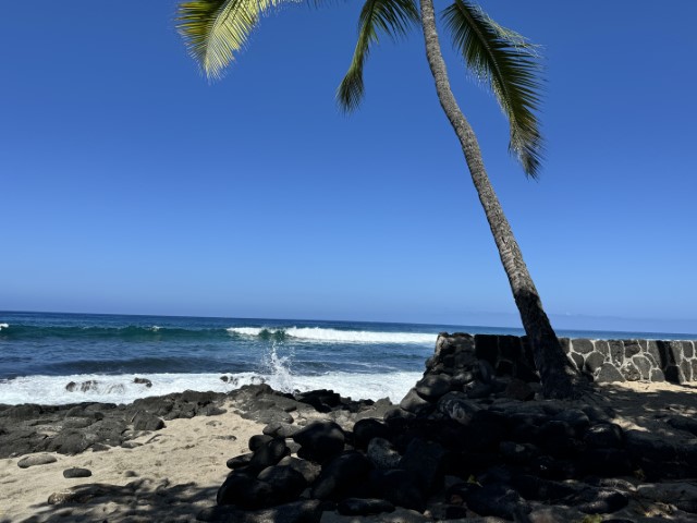 I really like this sweet little beach in Kona — there’s plenty of shade and white sand for a peaceful place to read a book or to watch surfers. It’s not a snorkel or swimming beach, but rather a quiet, shady spot with perfect views of palm trees, waves, and crystal clear waters.