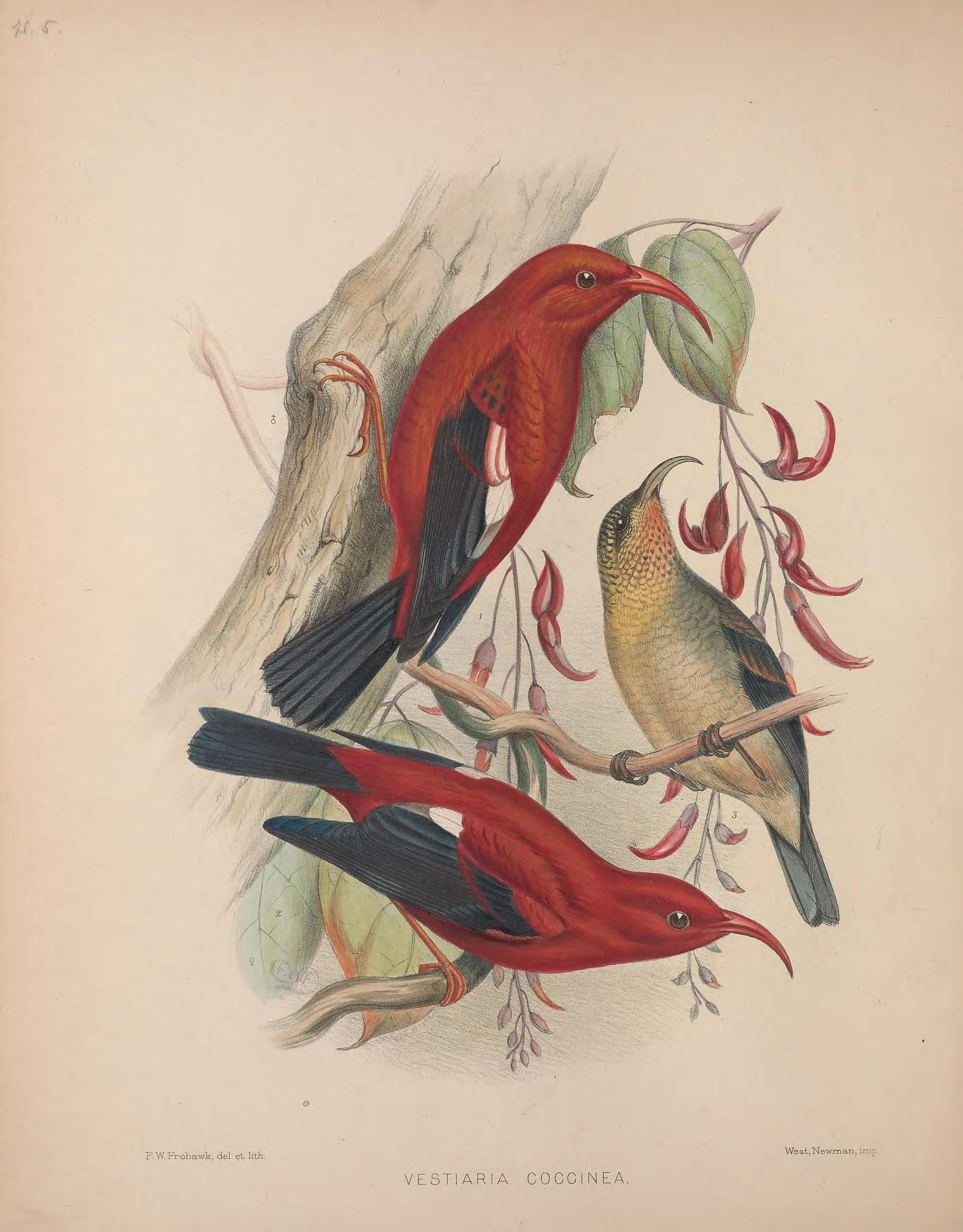 Frohawk, F.W., del. et. lith (1890-1899). Vestiaria n57_w1150 [image of illustration]. In Aves Hawaiienses : the birds of the Sandwich Islands. Public domain. Retrieved March 3, 2024, from https://www.flickr.com/