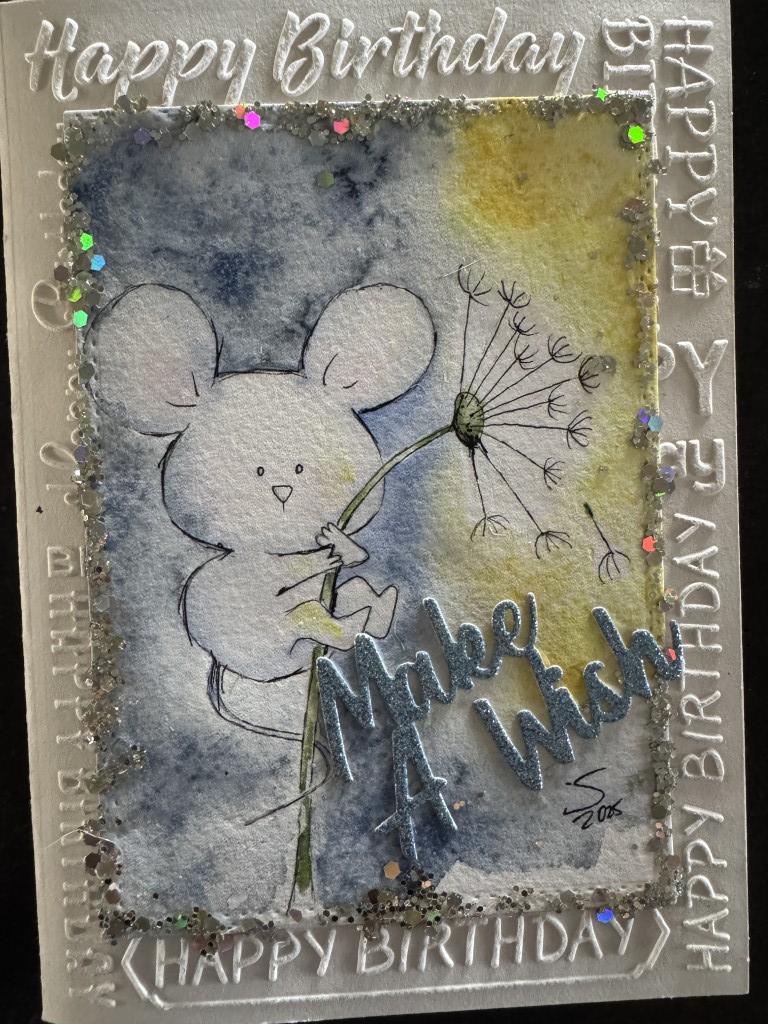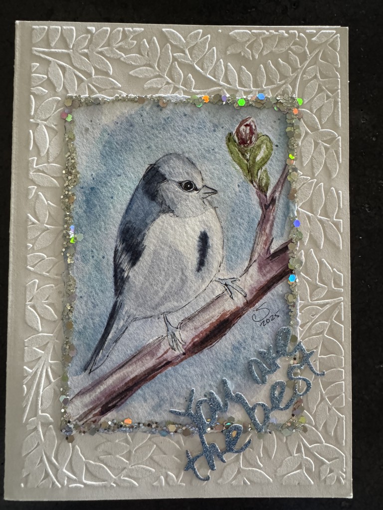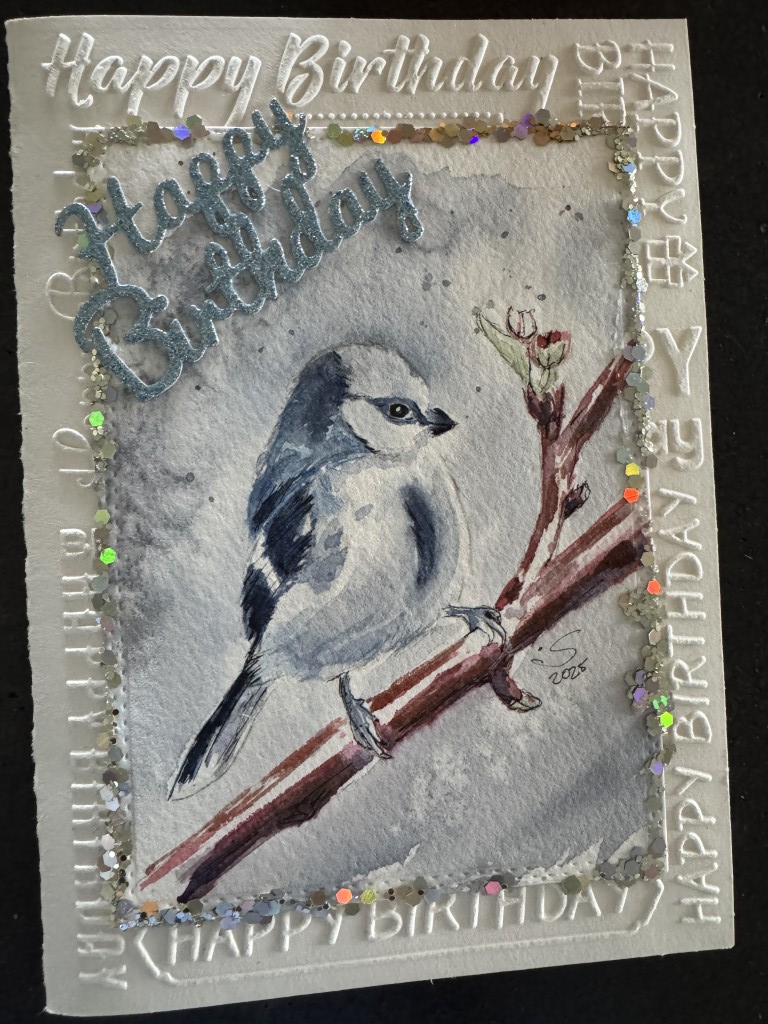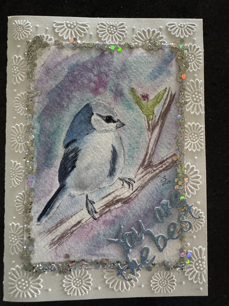 One bird (Azure tit) multiple ways, multiple occasions…Here, I’m playing with watercolor blooms to jazz up the background…not sure which I like the best…