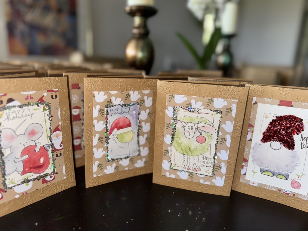 Some inspirations here: Aunt Dottie’s Connecticut farm (Sheep and rams) and my fav go-to xmas doodles including mouse, gnome, bird, snowman. All cards are individually embossed using a Sizzix Big Shot.