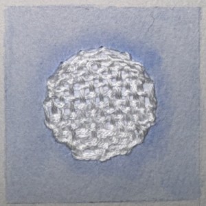 The white thread largely obscures the paper beneath. Shadows are smaller and more controlled, reinforcing a sense of structure and compression.